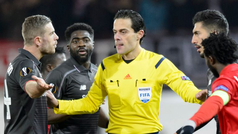 Jordan Henderson complains with the match referee during the 0-0 draw in Switzerland